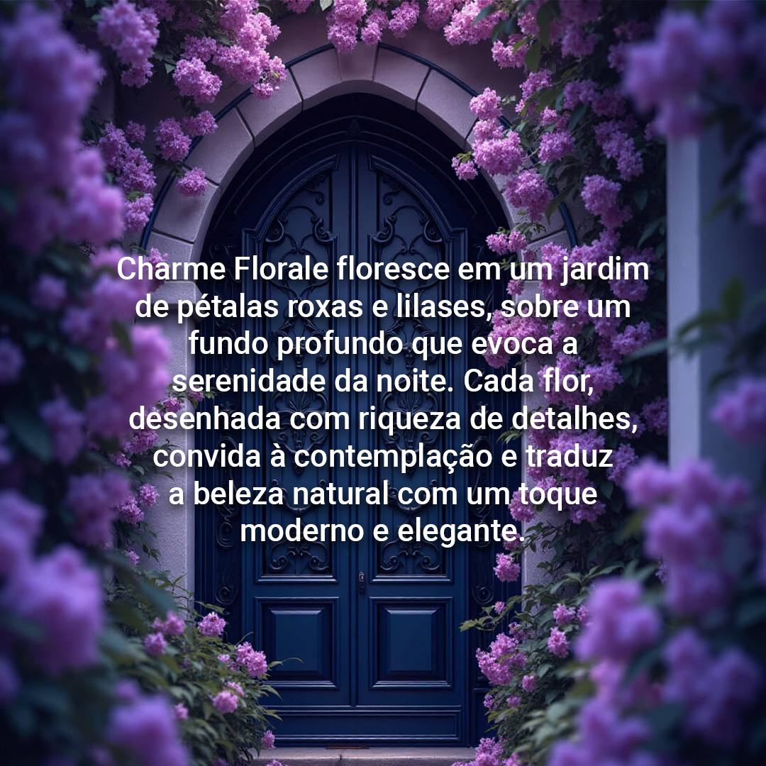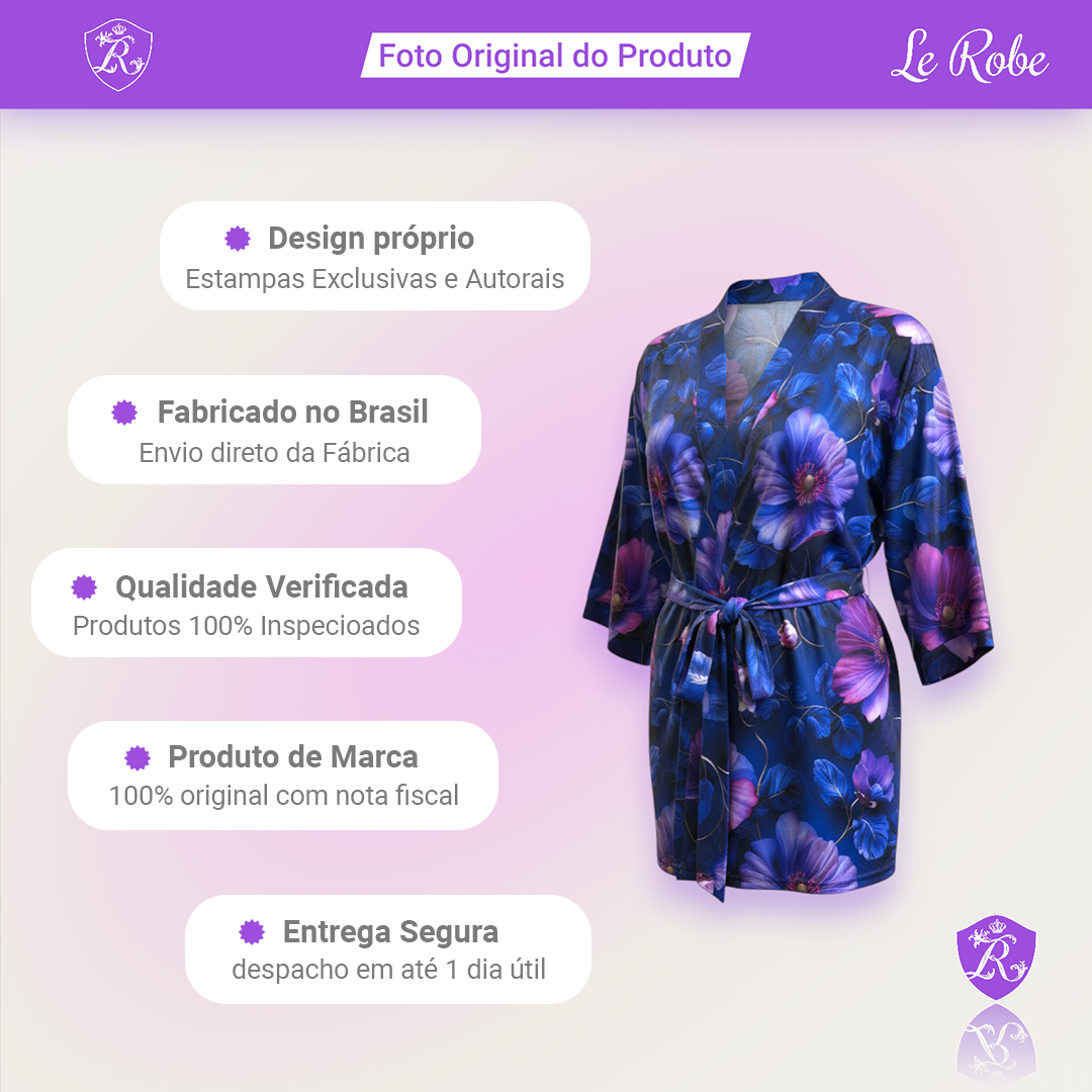 Charme Florale é um robe feminino floral que traduz paz e delicadeza com sofisticação. Suas flores roxas e lilases em um fundo profundo evocam serenidade, criando uma harmonia visual ideal para momentos de autocuidado e contemplação.