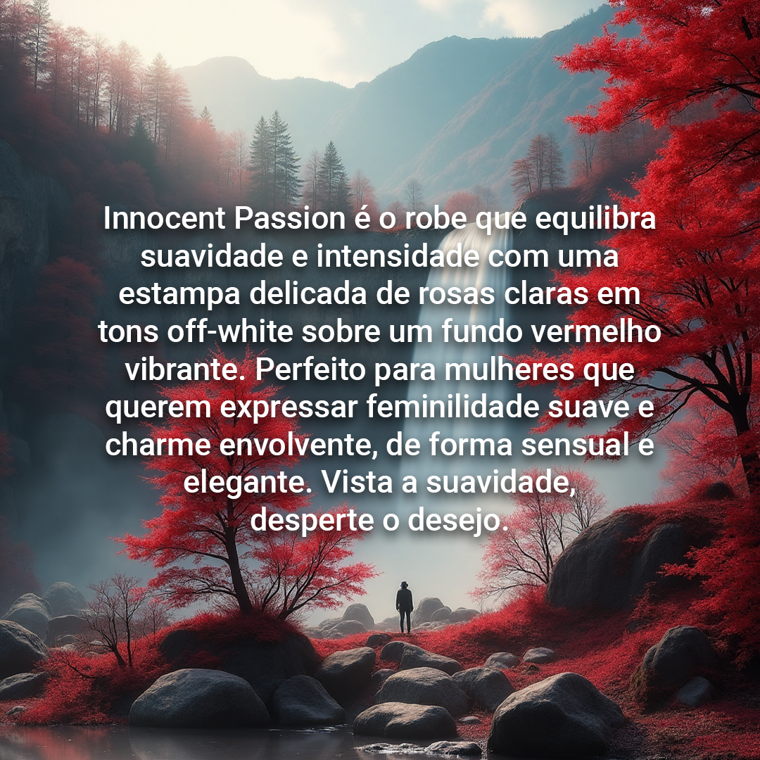 Innocent Passion é o robe que equilibra suavidade e intensidade com uma estampa delicada de rosas claras em tons off-white sobre um fundo vermelho vibrante. Essa peça traduz a pureza provocante de um desejo que nasce silenciosamente.